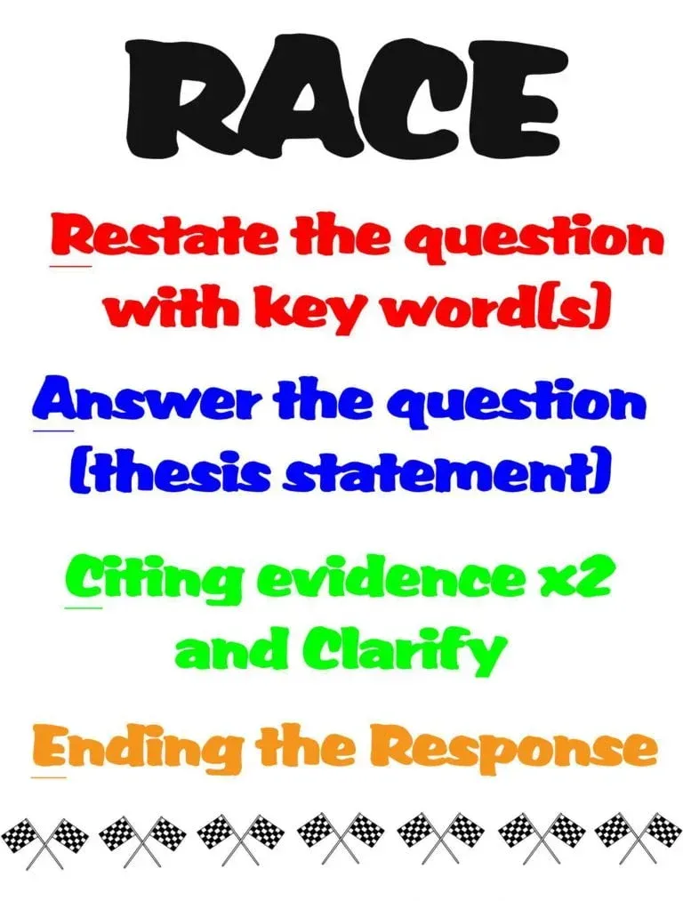 I almost never assume students know what I want and require. It just works out so much better when I tell AND show them my expectations. The same is true with writing – especially with writing. To teach the RACE formula, I go full out with a PPT slide show and cute sketch notes. It helps define the terms and gives students something to use as reference when they are on their own.
