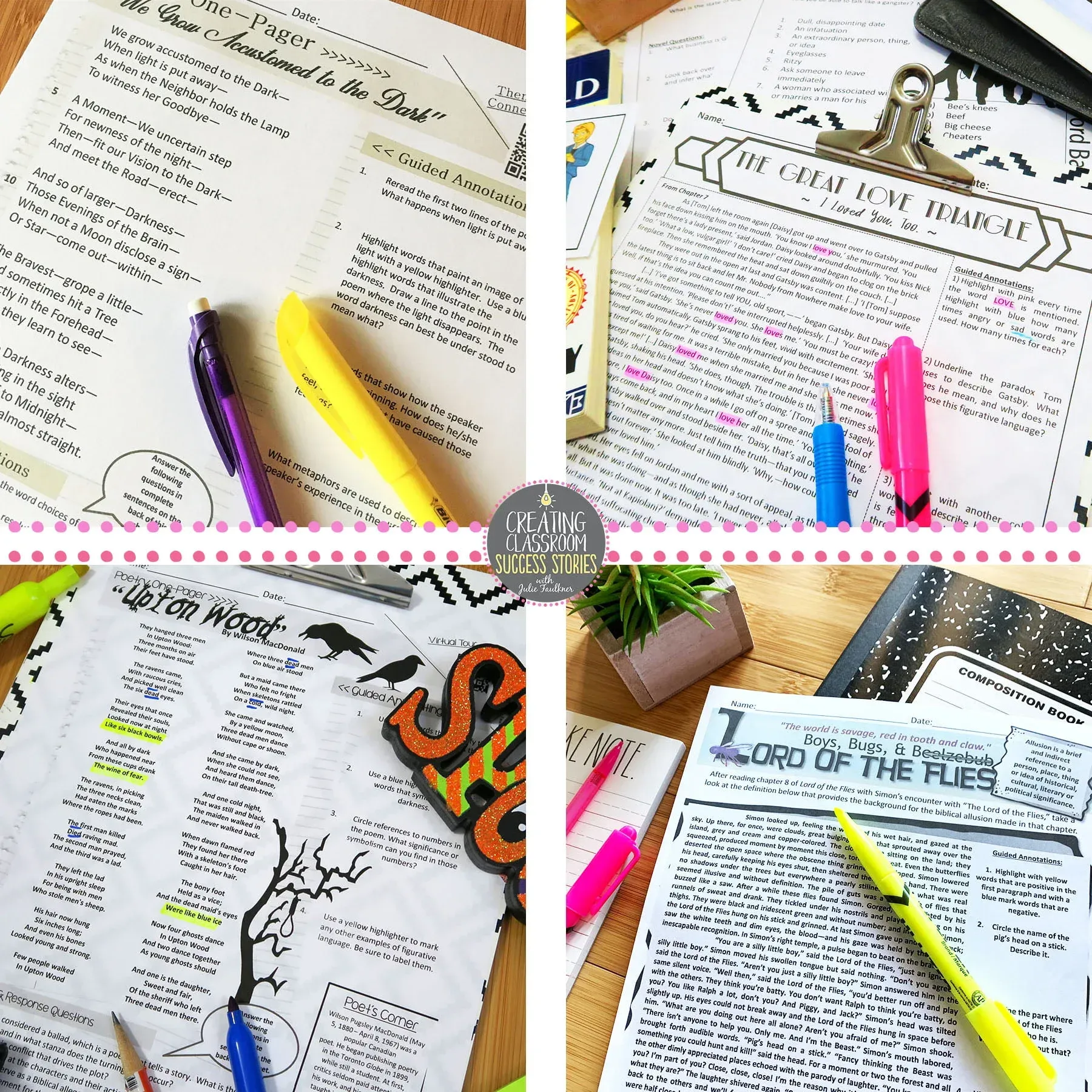 - Making the novel come alive for students is what it’s all about. I want them to feel connected to what we are reading, and putting up some decor or offering a small gift lets them know I think books are magical and that I want them to enjoy it. Most all of my novel units include posters for your classroom and bookmarks that make perfect gifts. You can bring some “drinks” when you start The Great Gatsby, for example. You can also sprinkle “gifts” throughout the unit. When we read The Crucible, we have beans and chicken blood after Acts 1 & 2, and during Macbeth, we have snacks of witches’ brew and fingernails. I even have shirts for *most of the novels that I teach to wear on the day I begin a novel. We can just call that walking decor! Yes, it’s #extra, but if it makes my students excited about reading, then I’m all in!