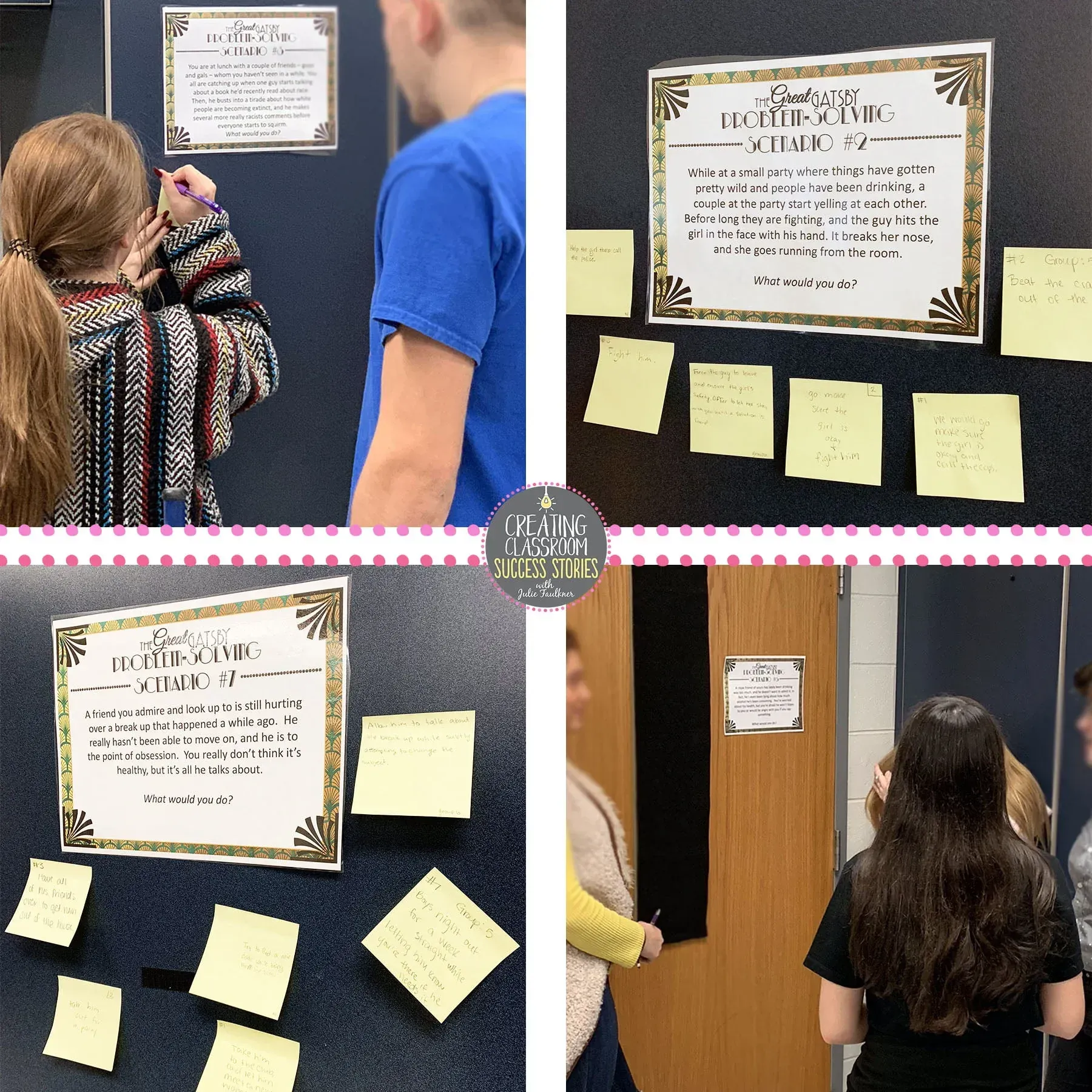 - Problem Solving Questions – When a book has a character who really has to deal with making tough decisions, a game of problem solving scenarios works really well. The Great Gatsby is ripe for characters who have to make tough decisions… even though most of the time they make the wrong one! To set up an activity like this, I write scenarios that the characters face, but I set them in modern times. Sometimes, I create a gallery walk, and students respond to them all. Other times, I give one scenario per group. It depends on what else I’m doing to start the unit and how much time I have.