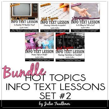When the CCSS started to roll out and there was so much emphasis placed on nonfiction, I’ll be honest – like many other “old English teachers” – I was nervous about giving up so much class time to those texts over my beloved classic fiction texts. Now, I love finding nonfiction texts that stand alone and/or that pair with my fiction. And, honestly, the kids LOVE it when they know it’s real. Students really “tune-in” with nonfiction because sometimes it’s so hard to believe that it is actually real! Sometimes I have them go searching on their own for real information – like in my mini research project on banned books in my Fahrenheit unit. Or other times, I’ll pair the info for them and have them dig into the material in class like in my lesson on the LeRoy HS outbreak after we read Act 1 of The Crucible. Also, take a look at several bundles of hot topics informational text lessons I have ready-to-go. Whether you teach English or not, finding ways to bring in the “real-world” aspect of your subject matter really gives your topic purpose, and I find students are much more likely to buy-in.