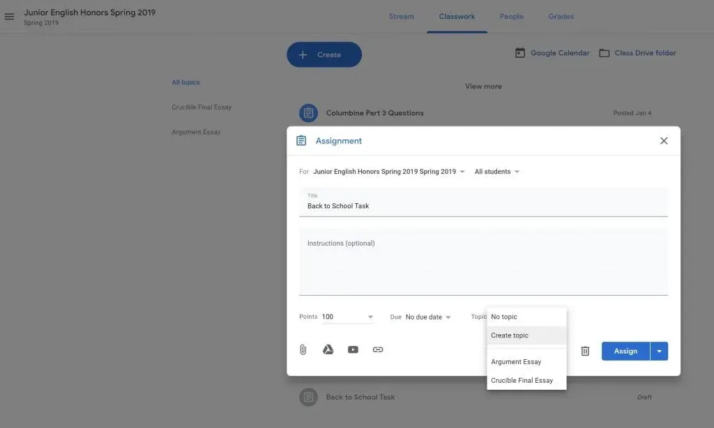 Keeping up with late work and dues dates is so easy with GC because you set all that when you create an assignment. I also love that all student work is submitted and stored in the assignment you create, so grading, responding, and presenting is so easy. GC also automatically makes folders in the Drive for each assignment, too. A new feature I love is the “Create a Topic” option, which takes the organization to a whole new level. Not to mention – the differentiation options that opens up: Create topics for varied levels of readers (with cute names/colors, etc.), post certain assignments in that topic, let them know what topic they are to click on, and set students on their individualized way.