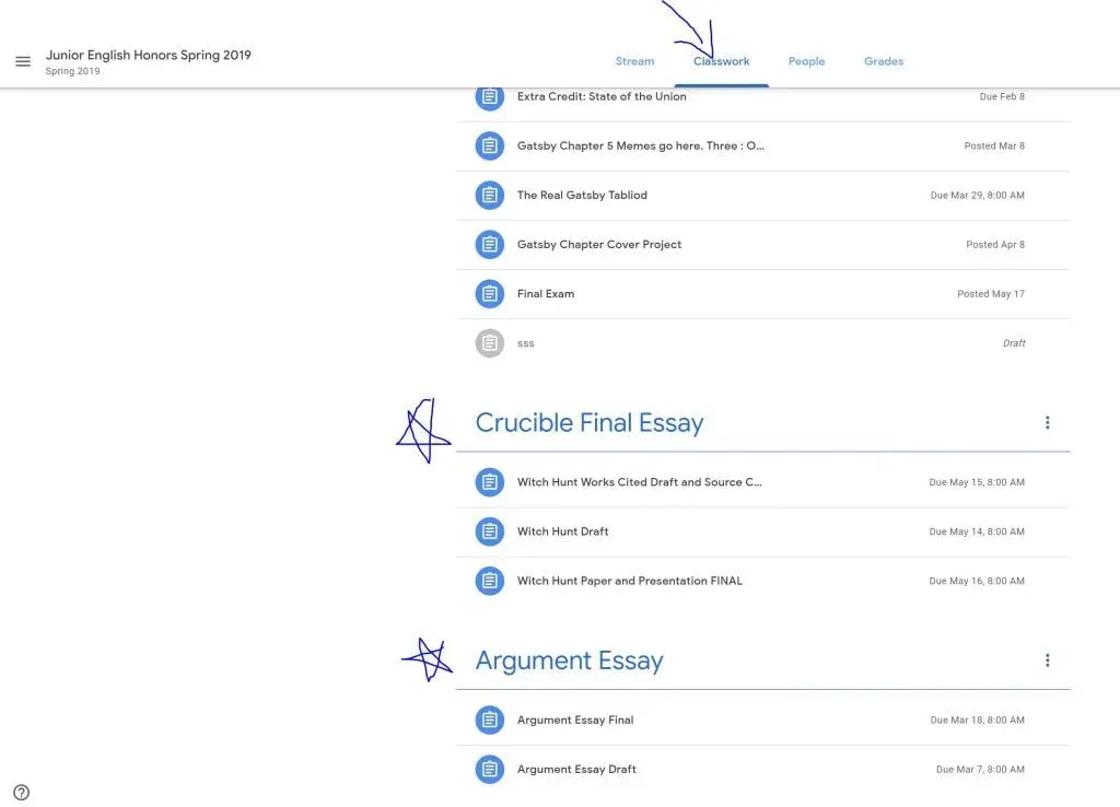 Another cool tool I like inside of GC is what I call the “Student at a Glance” sorting feature. When you click on the “People” tab, you see all of your students in a class. From there, you are able to click students one at a time, and all of the assignments, completion, grades, etc. show up. It’s perfect for conferencing, make up work, etc.