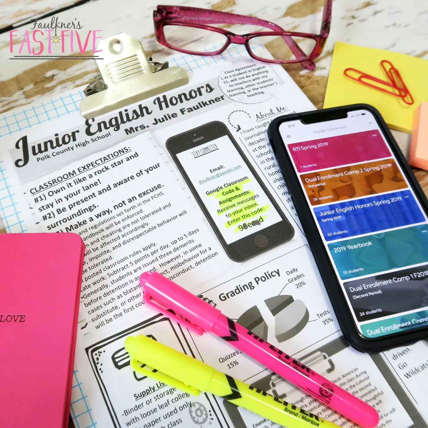 I set up my virtual classrooms as soon as I know my teaching assignments. Navigate to your Google Apps, and find the Classroom Tab. Once inside, just click the + sign by your picture to add a class. You can customize those pictures at the top as well using the free pictures included! GC will automatically generate a code for each class (find it in settings); all you need to do is copy it or project it and go. I like to put that code on my syllabus, and on the first day of school, I have my students join my Google Classroom. If students don’t already have the GC and email apps installed on their phones, I have them do that then, too.