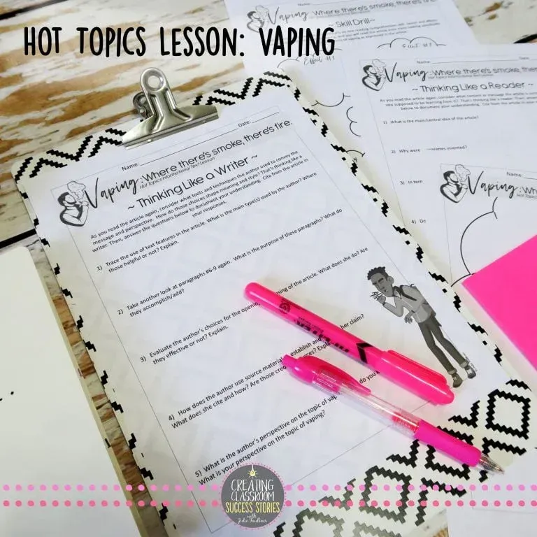 The articles I chose are all hot topics. Sometimes, both sides are presented, but other times, they lean one way. In either case, I have students prepare to take a side in writing. When there’s time, I host a debate. This is also an excellent time to review and prepare claims, counterclaims, and rebuttals. (See how I teach that in this free video.) Debating is an excellent way to practice speaking, listening, and citing evidence. Read more about Hosting Successful Class Discussions at this post. The important part to remember is that these debates will be textually informed and welcoming to both sides.