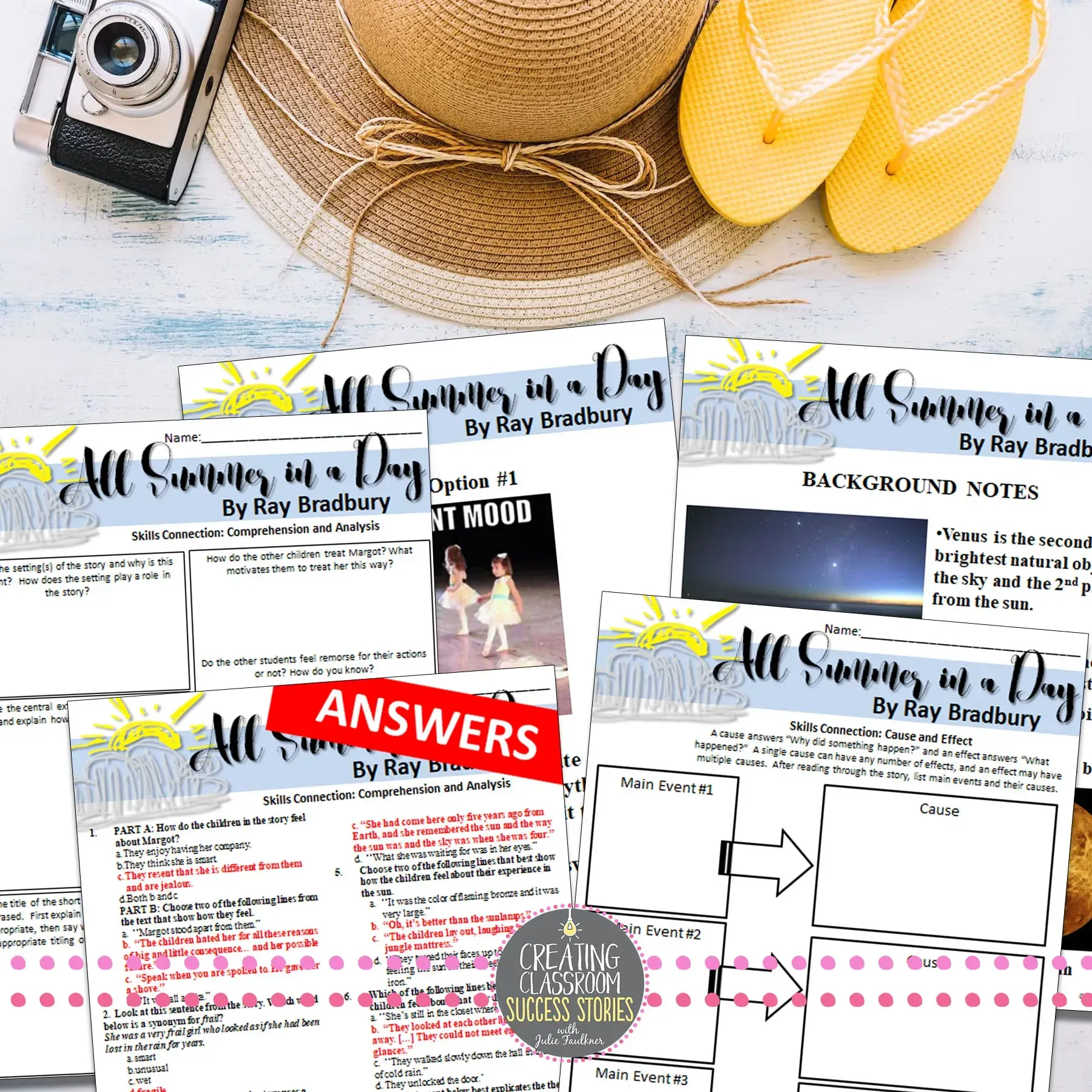 Ray Bradbury is the first author who comes to mind when science fiction is mentioned. He expertly explored and explicated his imagination of the future and even life outside of Earth in relation to and as a reflection of our own humanity. I’ll be reading his “All Summer in a Day” with my juniors for our eclipse lesson. While the characters in the story actually are waiting to see the sun, and we will be waiting to do the opposite on solar eclipse day, Margot, the main character, is literally in the dark and misses the experience entirely because of her antagonistic classmates. See my easy prep, ready-to-go lesson with other paired texts and a complete sun-themed unit. I think this lesson would also work well with younger students, too. If you are looking for a science fiction text for more advanced students, check out Isaac Asimov’s Nightfall. Pair it with my literary analysis task cards for any text, and your students won’t be in the dark for long.