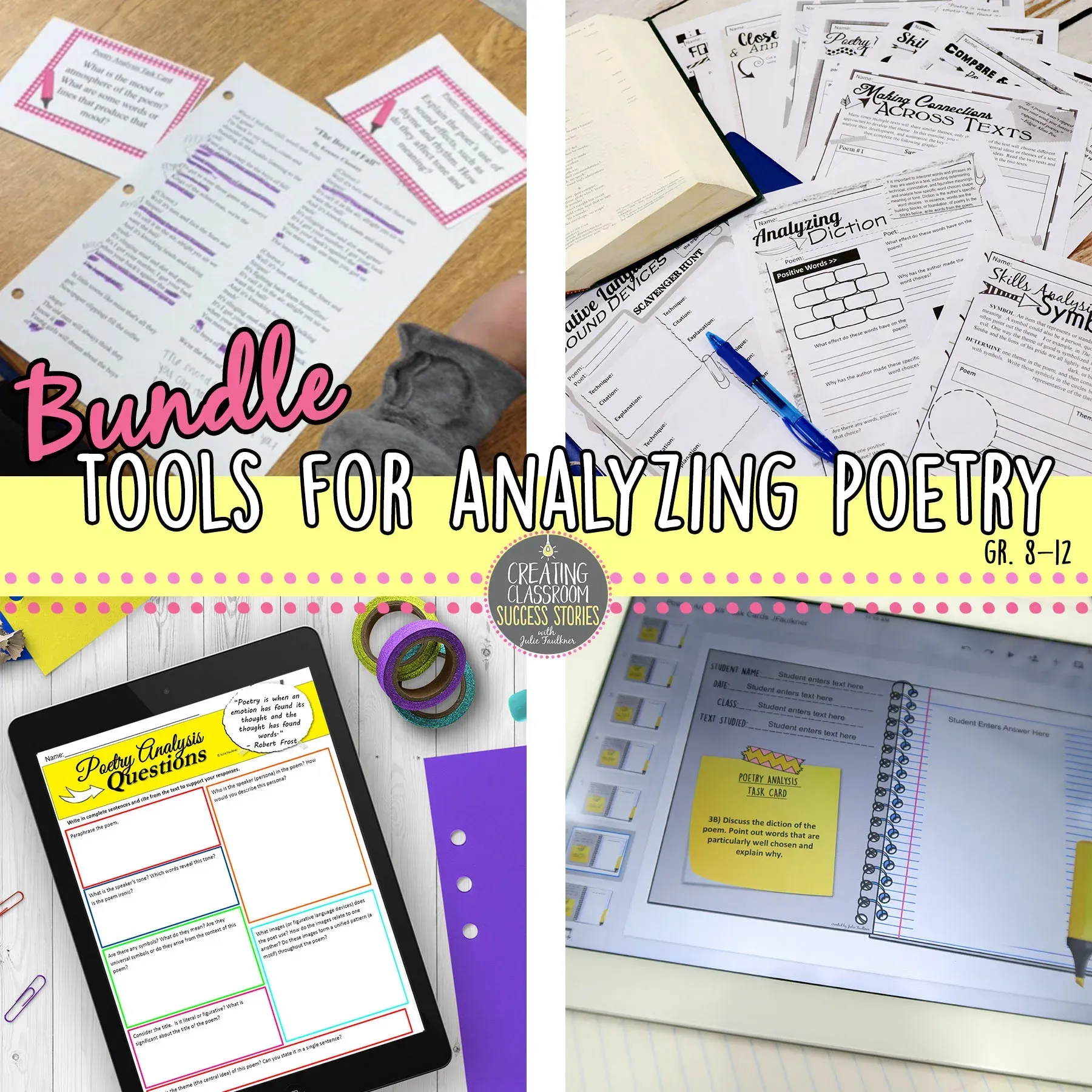 Students love the opportunity to listen to songs in class, and I don’t mind when we study them as poetry. Take a look at Pink Floyd’s “Eclipse” or Bonnie Tyler’s “Total Eclipse of My Heart.” These two songs in particular are rich with figurative language and a particularly appropriate dark tone. A classic poem that my students always connect with is Dylan Thomas’s “Do Not Go Gentle Into That Good Night.” It really makes them think! You can take a look at my poetry single activity for a no-prep lesson with this poem. Also, grab my poetry analysis bundle with a variety of tools including poetry worksheets, poetry analysis task cards that are perfect for stations, and vocabulary review games. You’ll be all set to guide your students through a celestial poetry analysis.