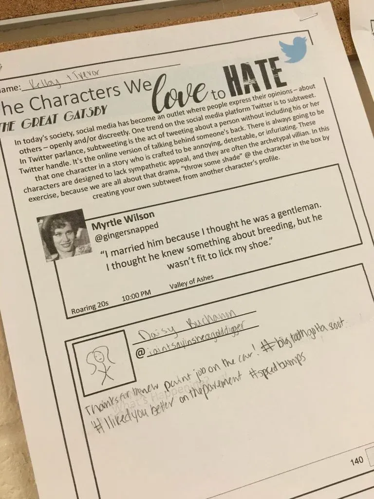 After reading Chapter 2 of The Great Gatsby, I feel it’s always important to discuss domestic violence. We close read that section of the chapter highlighting details like the cause of the conflict and the disparity between the men’s and women’s reactions. We set up a KWL chart, and I found a really great TED talk on the topic that we watched. (BTW: My The Great Gatsby Complete Unit is coming late 2019! You can get my The Great Gatsby video viewing guide here now!)