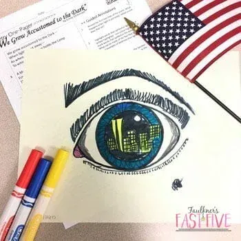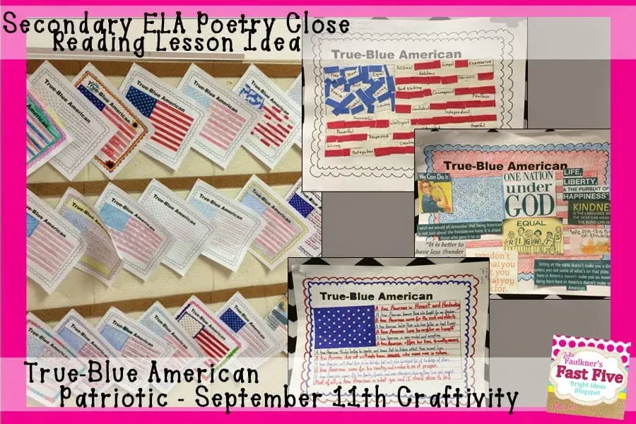 Some of my students are usually slightly familiar with what happened on 911, but it’s generally pretty foggy. I know that their history teacher is covering the facts, so I don’t usually need to take time to do that. However, I did want to do something and as an ELA teacher, and a thematic approach with textual analysis seemed fitting. While these poetry lessons could work for many other patriotic holidays or just as a stand-alone mini unit, I did it to bring up issues surrounding the events at Ground Zero. Most of the time, we are so focused on skills and objectives, that we forget to make text-to-self and text-to-world connections — and that is where the real magic happens. I like that these lessons allowed us to do that. To close the lessons, then, I give students a creative prompt. In the “True-Blue American” lesson, they designed a flag that illustrated what it means to really be a true-blue American. In the “We Grow Accustomed” lesson, students drew a picture that reflected light and hope. Looking at what they wrote and drew makes me proud to be a teacher in this great country.