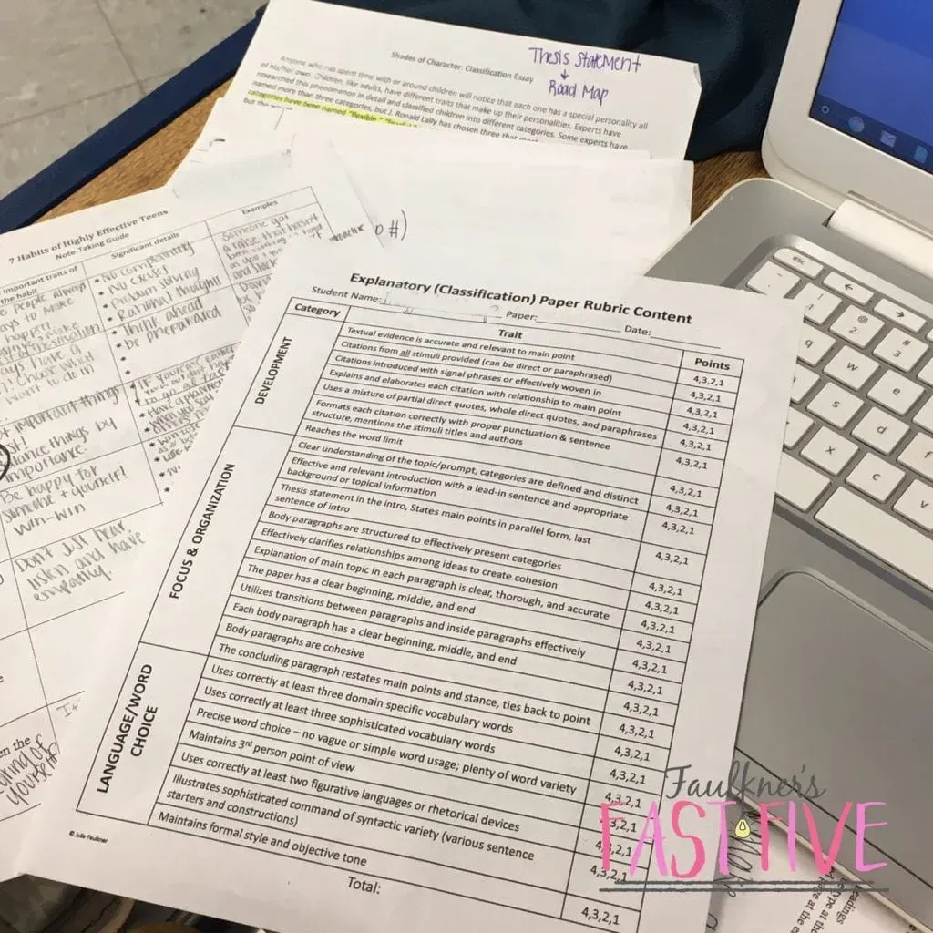 I have a carefully crafted rubric that is specific to the task, so it’s easy and quick to mark and when students get their grades back, they can see the areas of strength and weakness. I use a separate rubric for grammar. This might seem like it takes longer, but I score content, Grammar, and MLA separately. For me, it’s actually faster that way, so I can just focus on one thing at a time. Those rubrics are in my complete writing curriculum.