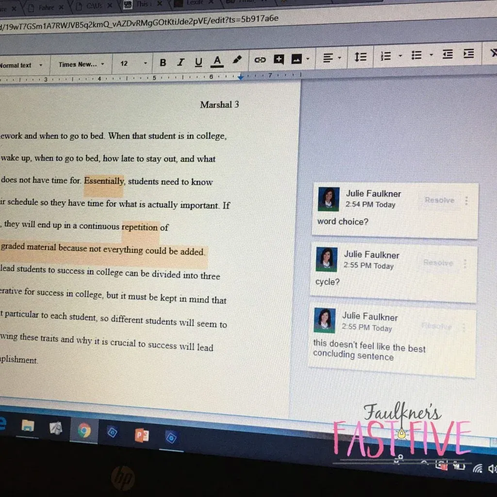 - First is planning time in the writing process to have check points that students submit via Google classroom – or whatever method works for you. Students submit thesis statements, works cited drafts, or even first paragraphs. Then I have a day in class that I “virtual conference” with them. While I’m leaving notes on their drafts, they continue with research typically. They can fix mistakes early and that saves me time later. Plus, I’m already familiar with the essay to a certain degree.