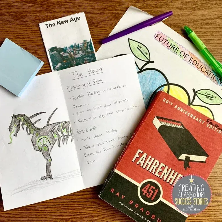 Fahrenheit 451 was published, it was considered a science-fiction novel, and it typically still is considered as such. Bradbury stated in interviews that his primary motivation for writing Fahrenheit 451 was concern for “how television destroys interest in reading literature.” With that fear as the guiding conflict, he traced the implications of too much television on a society… but not just television. I picture him wondering “Where could this talking box take us? and What else could possibly be invented?” What we got was the picture of a dystopian society that is frighteningly all too familiar to us less than 100 years from then. These “predictions” of technological advancements and the state of humanity ultimately serve as warnings to our culture and our students’ generation. That’s not to be missed. In fact, it’s so important to me that I close my unit by having students investigate those predictions (earbuds, robot dogs, smart homes, etc.) to determine if they are really predictions or not. That short research project is included in my Complete Literature Guide for teaching Fahrenheit 451. By completing the project students note how the “predictions” really do come true and that they weren’t really all that far-fetched to begin with. We discuss, then, how that allows us to truly connect with the text, and it really does become the mirror that Bradbury intended.