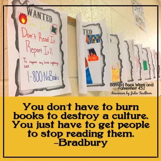 I can’t imagine a world where people don’t want books, but I don’t live under a rock, either. As an English teacher, I regularly face resistance to reading from my students, and I see them moving further and further away from choosing to read. Books introduce ideas; they enable to us to travel to new places and meet new people; they give us education; they move us; they make us think; they make us look more closely at ourselves, which is what I think this book does so well. Bradbury’s gift was being able to look at the world around him and wonder… “what if?” and “why?” Ultimately, controlling books through censorship removes a sense of wonder from the world, and if nothing else, I want students to walk away from a unit on Fahrenheit thinking critically and knowing it’s ok – and encouraged – to wonder. After all, “There must be something in books, something we can’t imagine, to make a woman stay in a burning house.” I love doing my banned book project around Banned Book Week that asks students to research why certain books have been banned throughout history. This project is included in my Complete Literature Guide for teaching Fahrenheit 451.